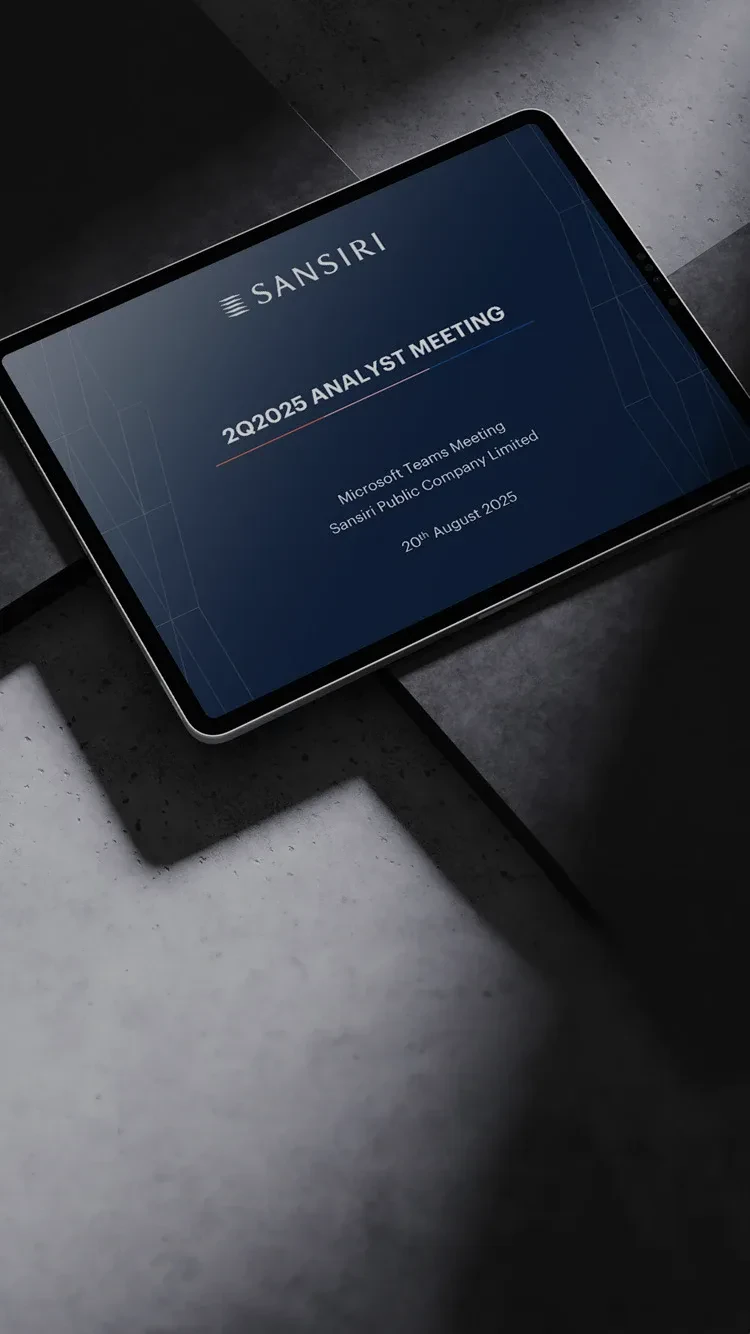 Sansiri is a leading real estate developer in Thailand, offering a wide range of products and services that cater to diverse customer needs, with a strong focus on design excellence and quality. The Company also invests in related businesses to enhance long-term value, including property technology, industrial and community developments, and digital financial services, while promoting sustainability across its operations.